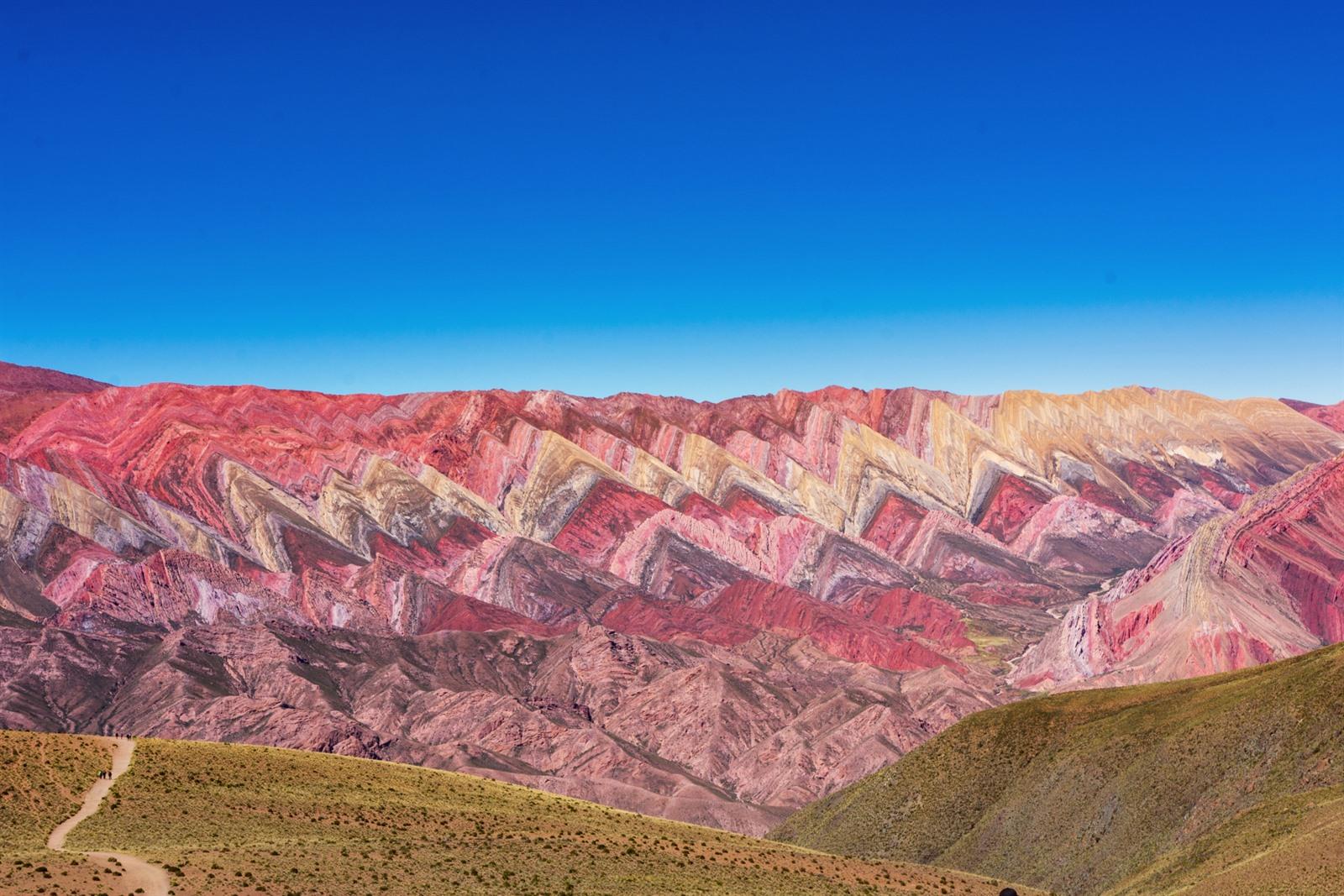 Hornocal is zonder twijfel een van de spectaculairste uitzichtpunten van heel Argentinië. De bergketen vouwt zich als een reusachtige waaier open, met zigzaglijnen in rood, oker, geel, groen en paars. De lokale bevolking noemt het Serranías del Hornocal, maar reizigers spreken meestal gewoon over de 14-kleurenberg. In het namiddaglicht lijken de kleuren bijna te branden.