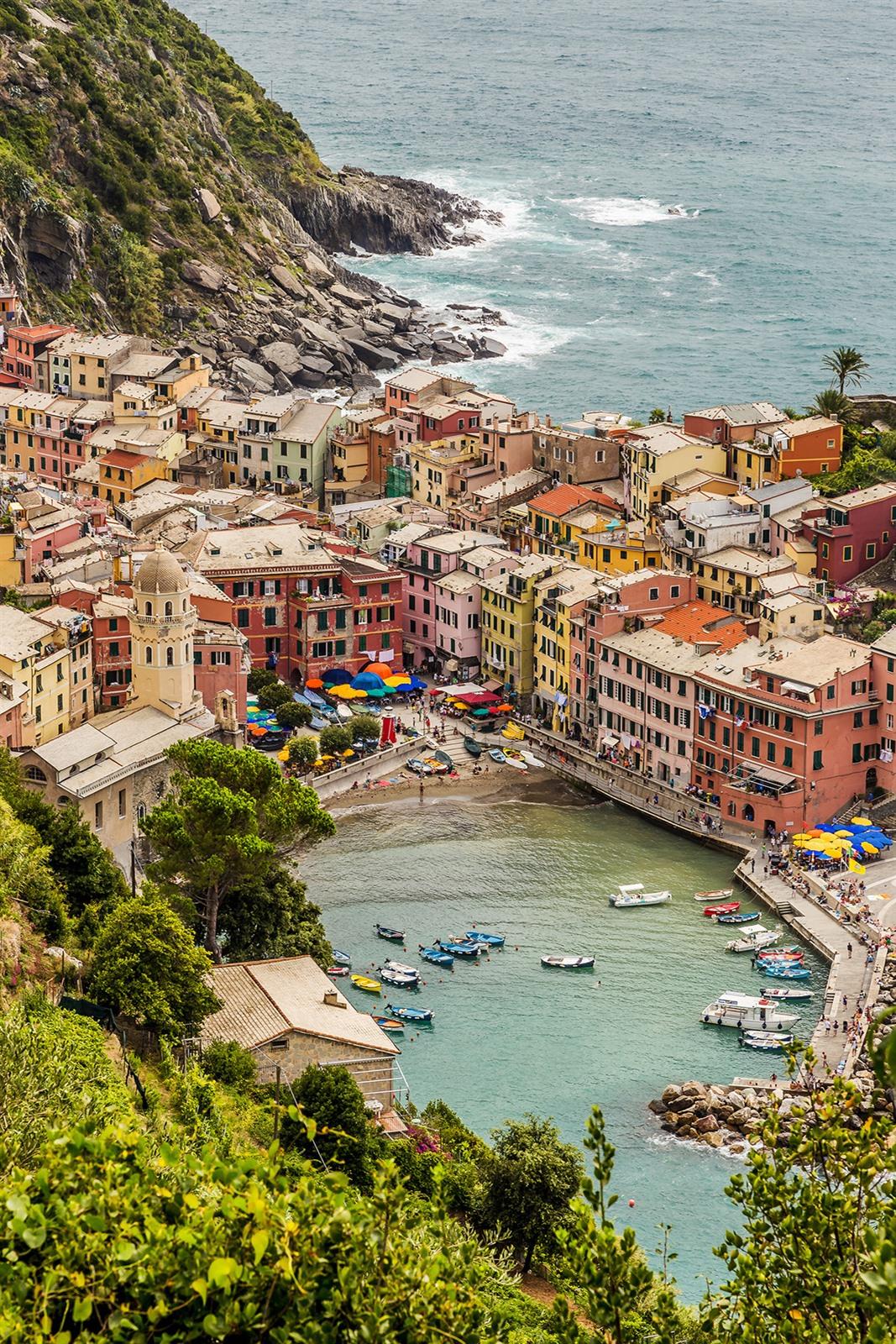 Het pittoreske Vernazza is een van de Cinque Terre-dorpjes aan de noordwestelijke kust in de Italiaanse regio Ligurië. De Cinque Terre is een reeks kleine dorpjes die letterlijk tussen zee en steile rotsen zijn vastgeklemd. Vernazza ligt ongeveer in het midden van die vijf dorpen, tussen Monterosso al Mare en Corniglia, en kijkt uit over een kleine haven. Wie graag dit dorpje bezoekt, doet dat best per boot, trein of te voet (lees meer over bereikbaarheid).