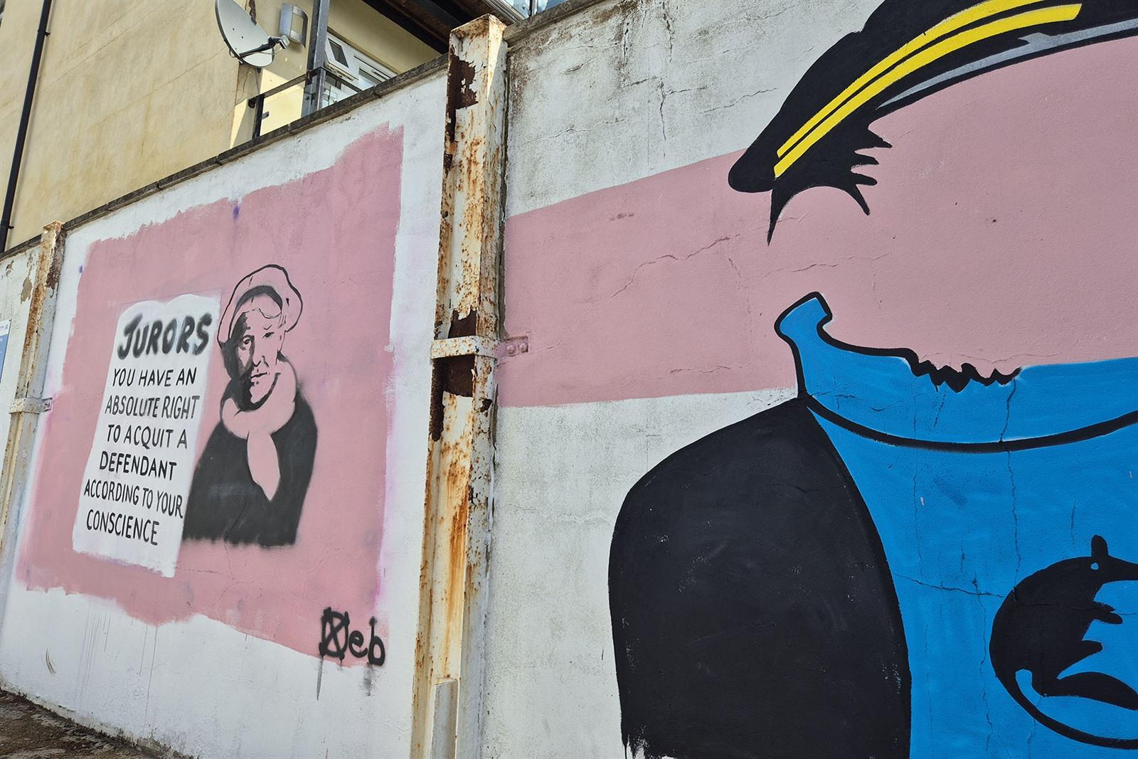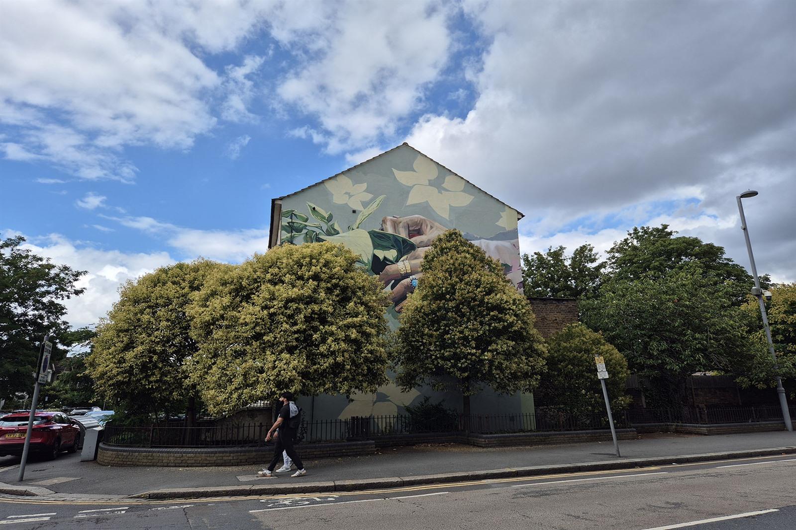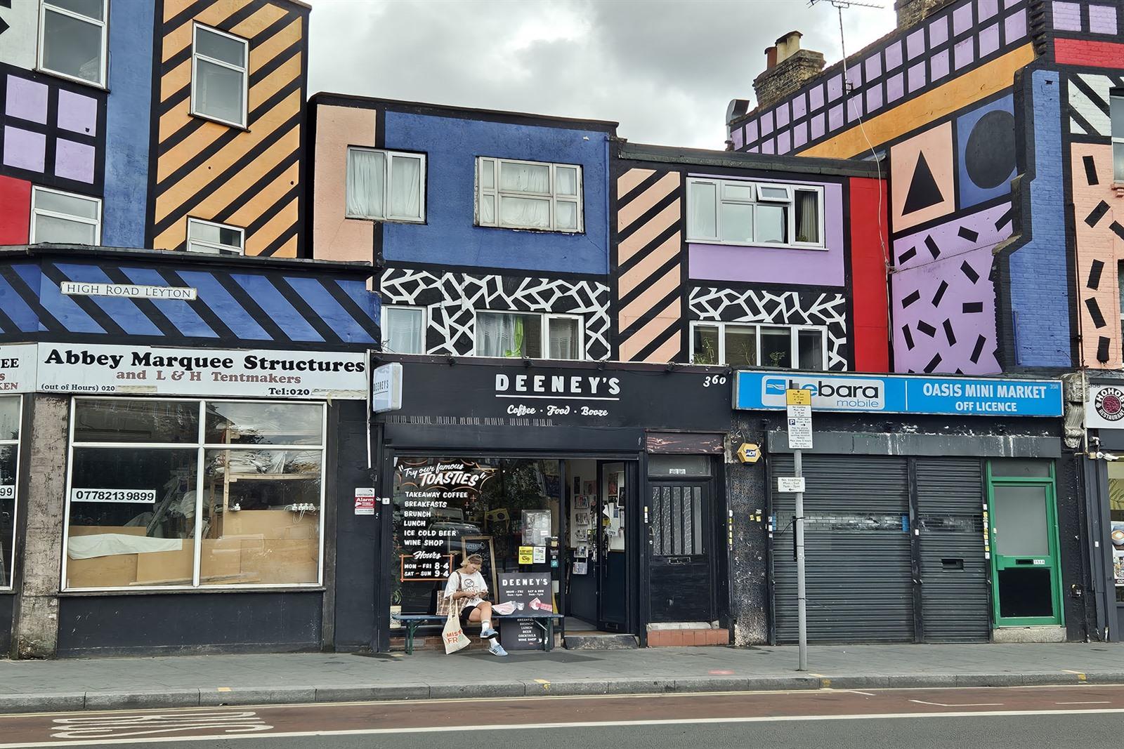 Sla rechtsaf en wandel door een typisch Engelse residentiële wijk tot je weer op High Road komt. De kleurrijk beschilderde muren met geometrische vormen vallen meteen op. Met behulp van een crowdfunding, lokale winkels zoals Deeney’s en de lokale gemeenschap werd er met gerecycleerde verf een heel blok opgefrist. De paarse, blauwe en gele kleuren vallen meteen op in het bijzondere ontwerp door de Franse Camille Walala, een belende grafische ontwerpster wiens kleurrijke creaties je wel vaker in Londen tegenkomt.