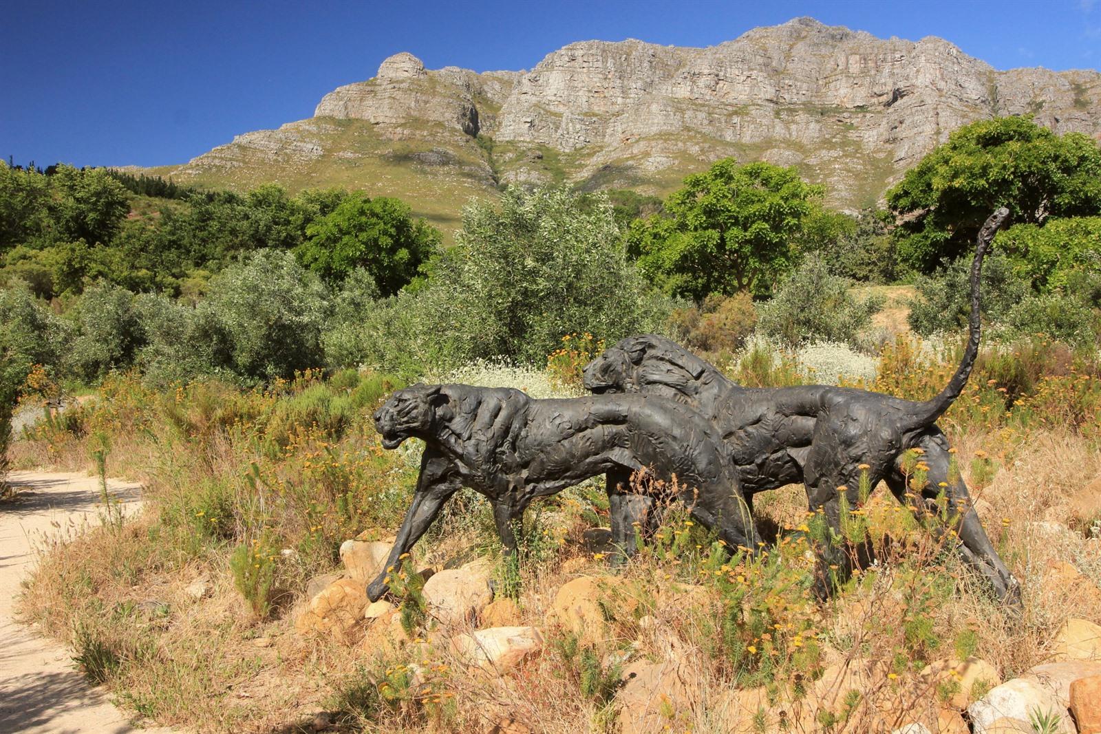 De Zuid-Afrikaanse beeldhouwer Dylan Lewis staat bekend om zijn rauwe, krachtige sculpturen van mensen, dieren en hybride wezens. In deze tuin, ooit een verlaten stuk grond aan de voet van de Helderberg, creëerde hij een labyrint van wandelpaden, vijvers, veldbloemen en stenen muren. Tussen het groen doemen plots monumentale beelden op: een liggende man in brons, een sluipende luipaard, een torso in beweging.